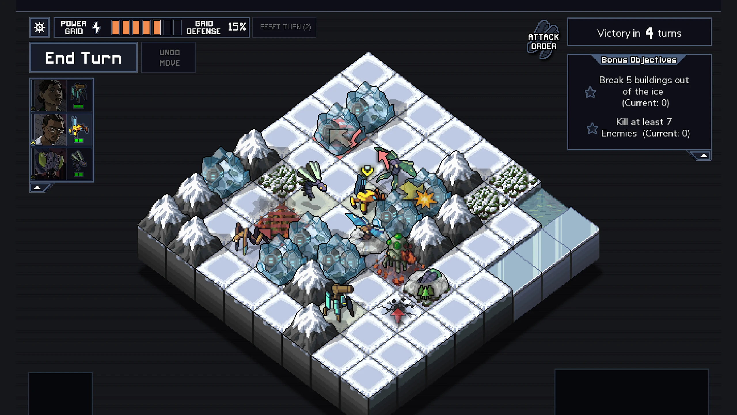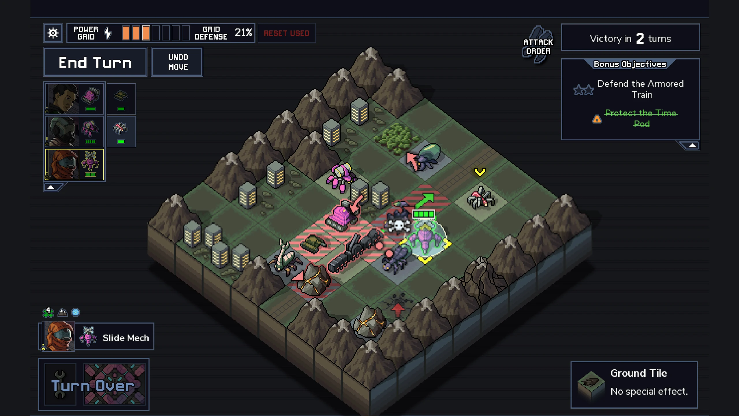 • Mục tiêu là Bảo vệ, không phải Tiêu diệt: Lưới điện (Power Grid) của bạn được cung cấp năng lượng bởi các tòa nhà dân sự. Quái vật Vek sẽ ưu tiên tấn công các tòa nhà này. Thay vì cố gắng giết sạch Vek, mục tiêu chính của bạn là dùng Mechs để che chắn sát thương, cản đường, hoặc đẩy chúng ra khỏi quỹ đạo tấn công để bảo vệ người dân sống sót qua số lượt (Turns) quy định.