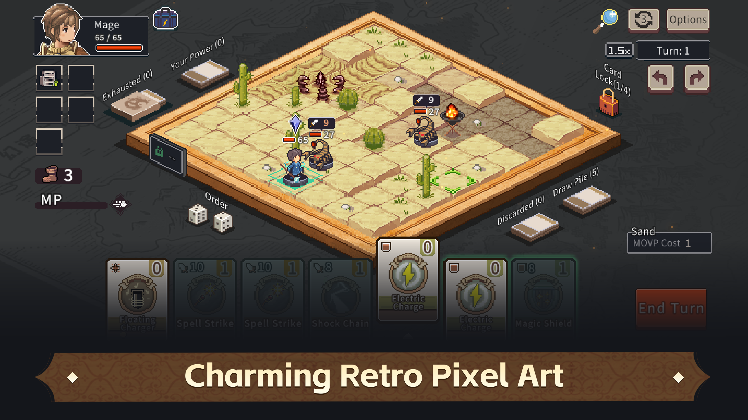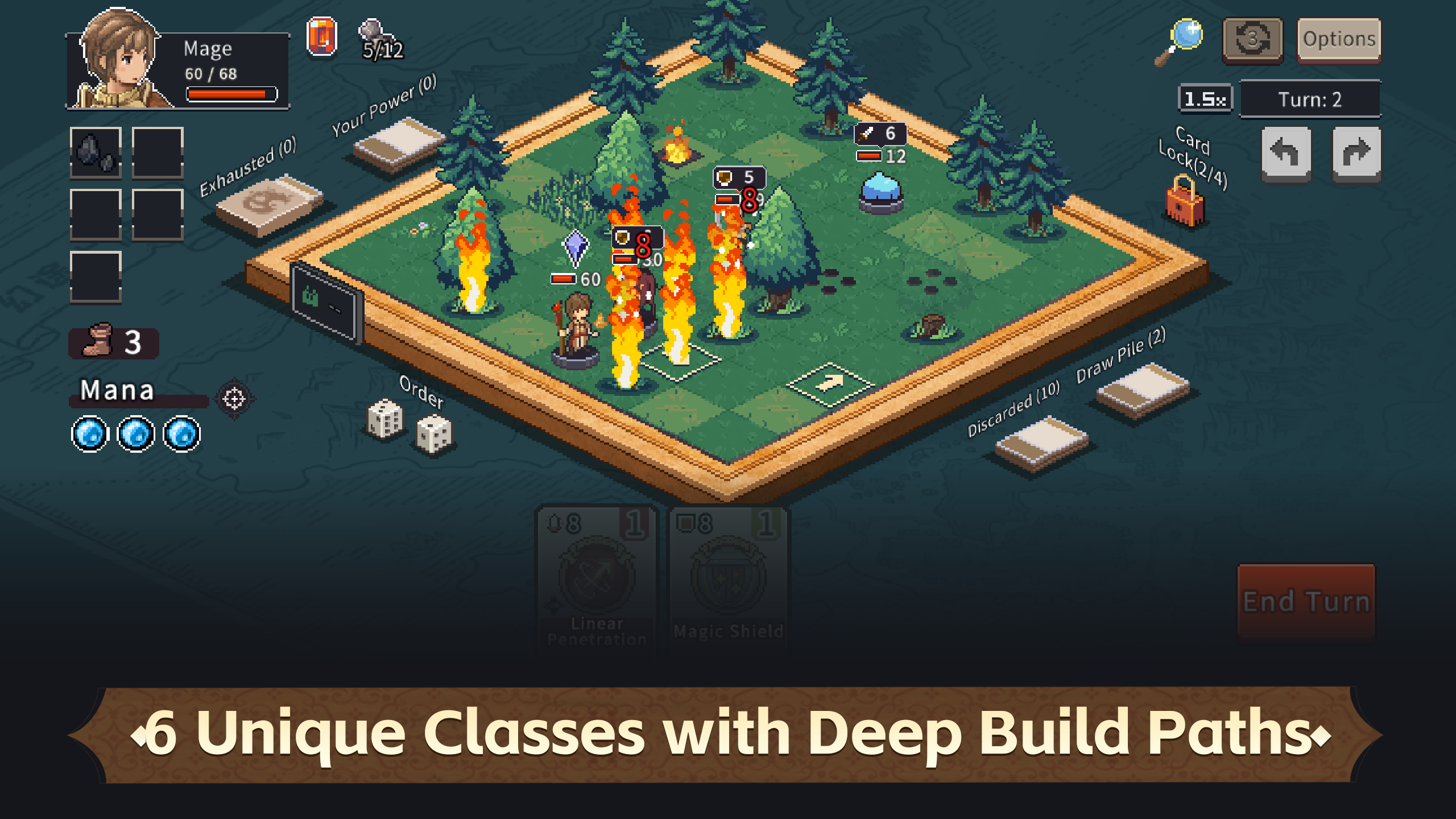 Chiến đấu trên bàn cờ 8×8: Bạn không chỉ đứng yên một chỗ để đánh bài. Mọi cuộc chiến đều diễn ra trên một bàn cờ dạng lưới. Vị trí đứng, tầm nhìn, khoảng cách và các chướng ngại vật (như bẫy, vật cản) đóng vai trò sống còn. Bạn phải quan sát trước ý định di chuyển/tấn công của kẻ thù để dùng bài di chuyển né đòn, hoặc lùa quái vật vào bẫy.