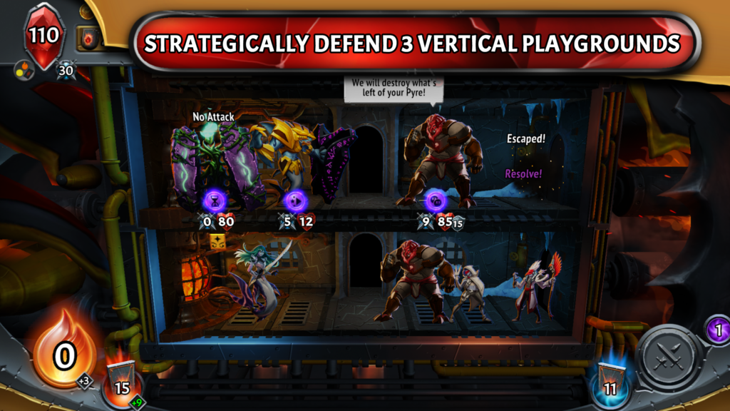 • Chiến trường ba tầng: Kẻ địch tấn công từ tầng dưới cùng và leo lên để phá hủy lõi Pyre của bạn ở tầng trênสุด. Bạn phải bố trí quái vật và sử dụng phép thuật trên cả ba tầng để chặn đứng chúng.